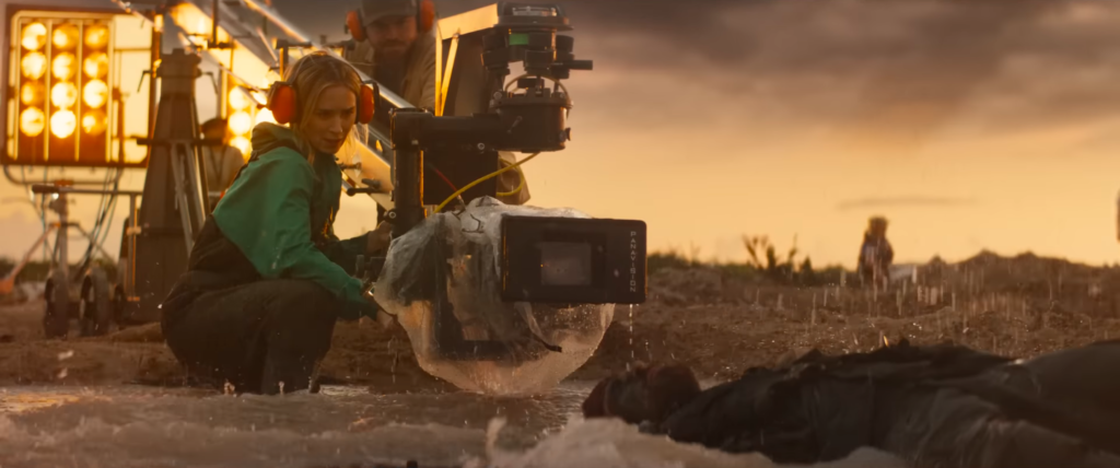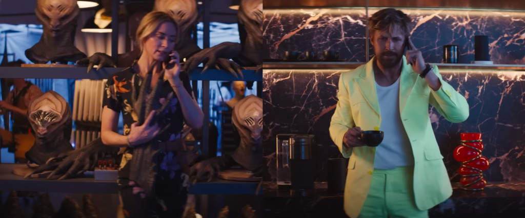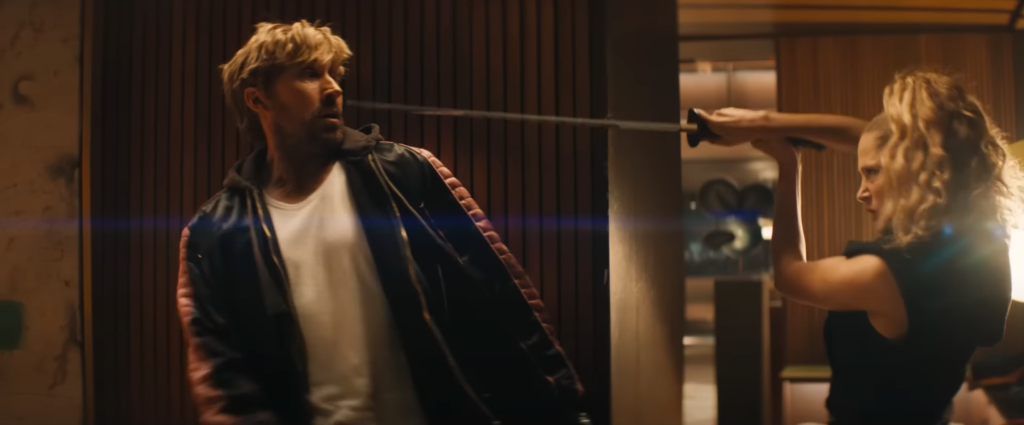 Mas, Leitch também brinca com a linguagem cinematográfica e traz outros momentos interessantes, como uma luta de Gosling em uma casa noturna, quando ele é drogado e passamos a ver efeitos de animação e borrados na tela, acompanhamos a subjetividade do personagem. Há ainda uma sequência criativa com a tela dividida, na qual os personagens debatem sobre o próprio recurso. E tem o filme que está sendo produzido dentro de O Dublê, “Metalstorm”, que é uma total chacota com Duna.